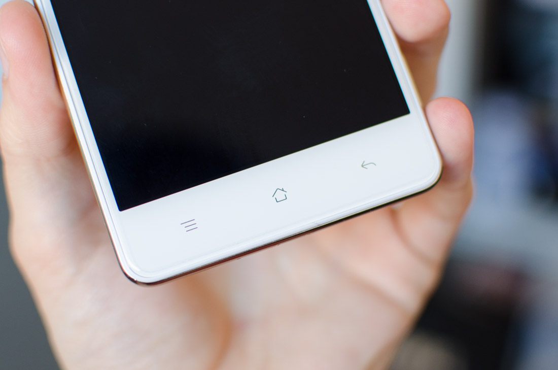 Below the display, Oppo has included capacitive navigation buttons. Two mistakes have been made here: the back button occupies the rightmost spot while it really should be on the left; and on the left Oppo has bizarrely opted for a menu button rather than the app switcher button. The menu key has been depreciated for years now, and no OEM shipping an Android 5.0 device or newer should include it. It actually hurts multitasking on this device to have to hold the menu key to switch apps.
