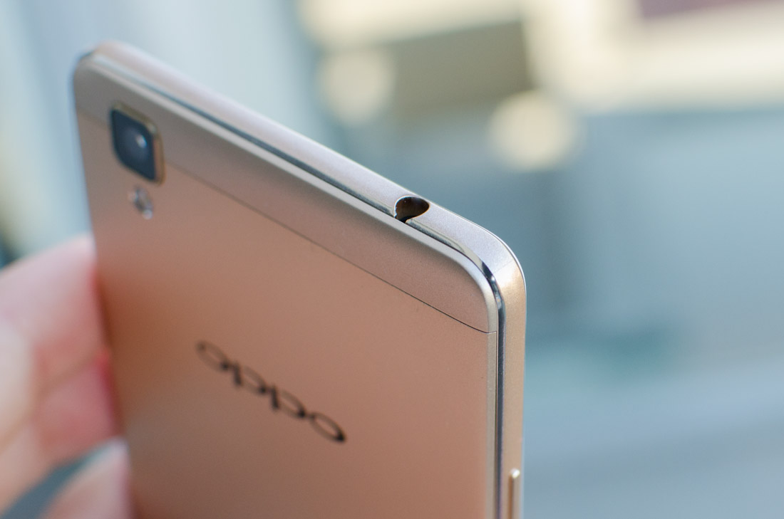 However, there are some very noticeable parts to the F1’s design that aren’t metal. To the top and bottom of the back panel are two plastic strips, which Oppo has attempted to blend into the metal segment by coloring them gold. This move doesn’t pay off at all, and the difference in color and reflectivity is extremely visible. It’s almost like Oppo wanted to introduce contrast to the design by using a different color for the plastic sections, but poorly chose gold to complement a different gold.